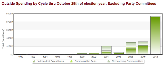 Two of the key words above are "independent expenditures." Under Citizens United, donors cannot give unlimited sums of money directly to specific candidates; however, they can spend unlimited sums (usually on political advertising) in support of specific candidates -- just as long as they don't actively coordinate with those campaigns. Citizens United's deregulation of independent expenditures has resulted in much more spending by individuals and groups trying, independently, to get "their candidate" elected in hopes of securing policy outcomes those donor prefers. You can see this, anecdotally, when you turn on the TV and see political ads (mostly negative) from independent groups with vaguely patriotic names like "American Crossroads," "Restore Our Future," and "Priority Actions USA." These groups are known as "Super PACs" -- groups that exist to support a candidate or cause through independent expenditures. More systematically, if we compare the 2012 presidential election cycle to the 2008 cycle, we see enormous rises in campaign contributions (generally) and independent expenditures (more specifically):